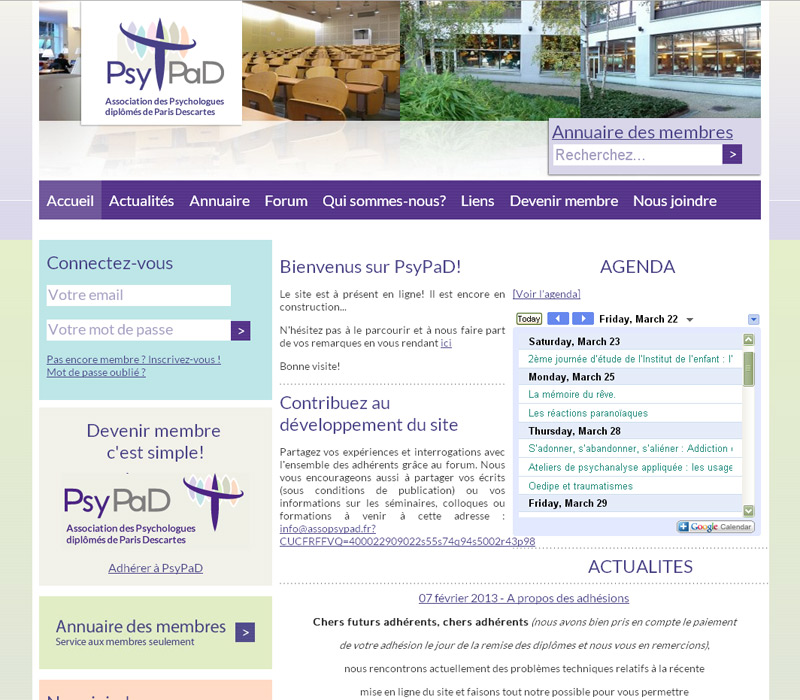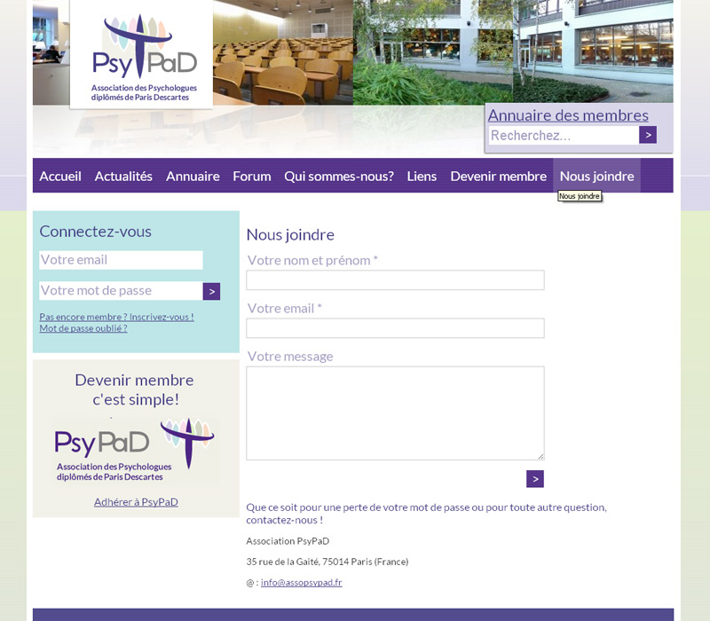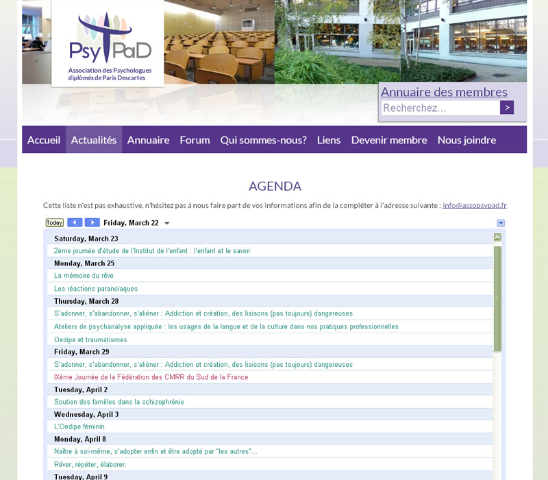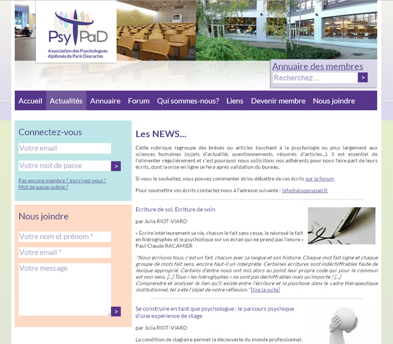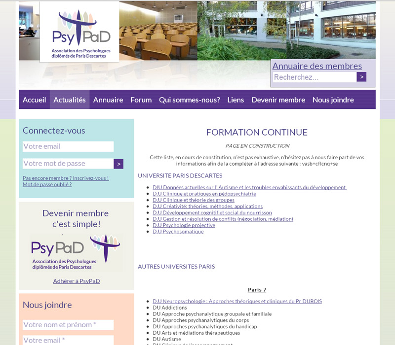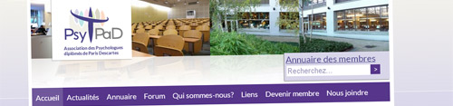 Lien vers le siteL'association française PsyPaD a été créée début 2011 par des psychologues diplômés de l'Université Paris Descartes.