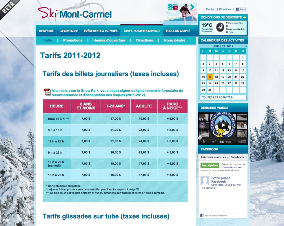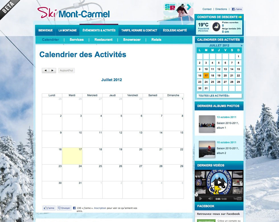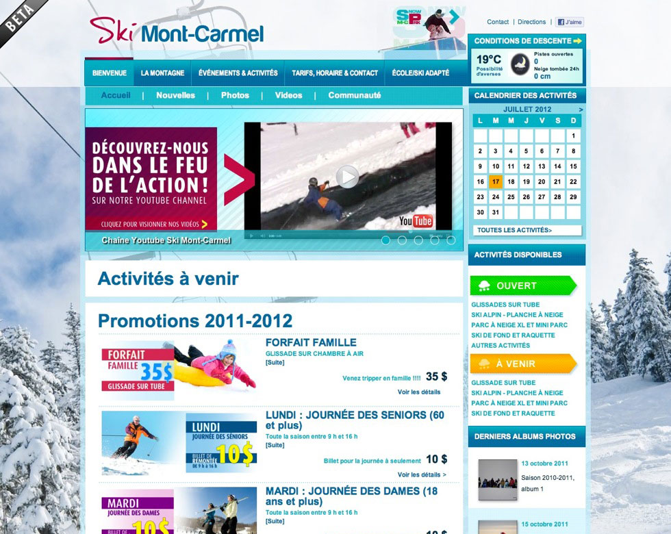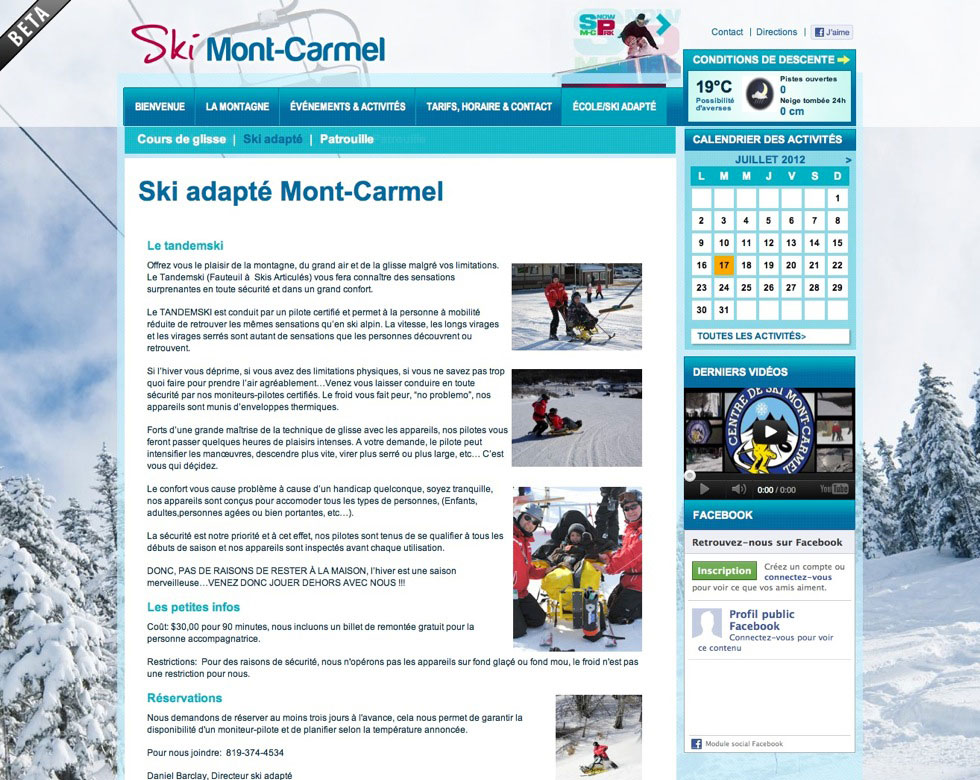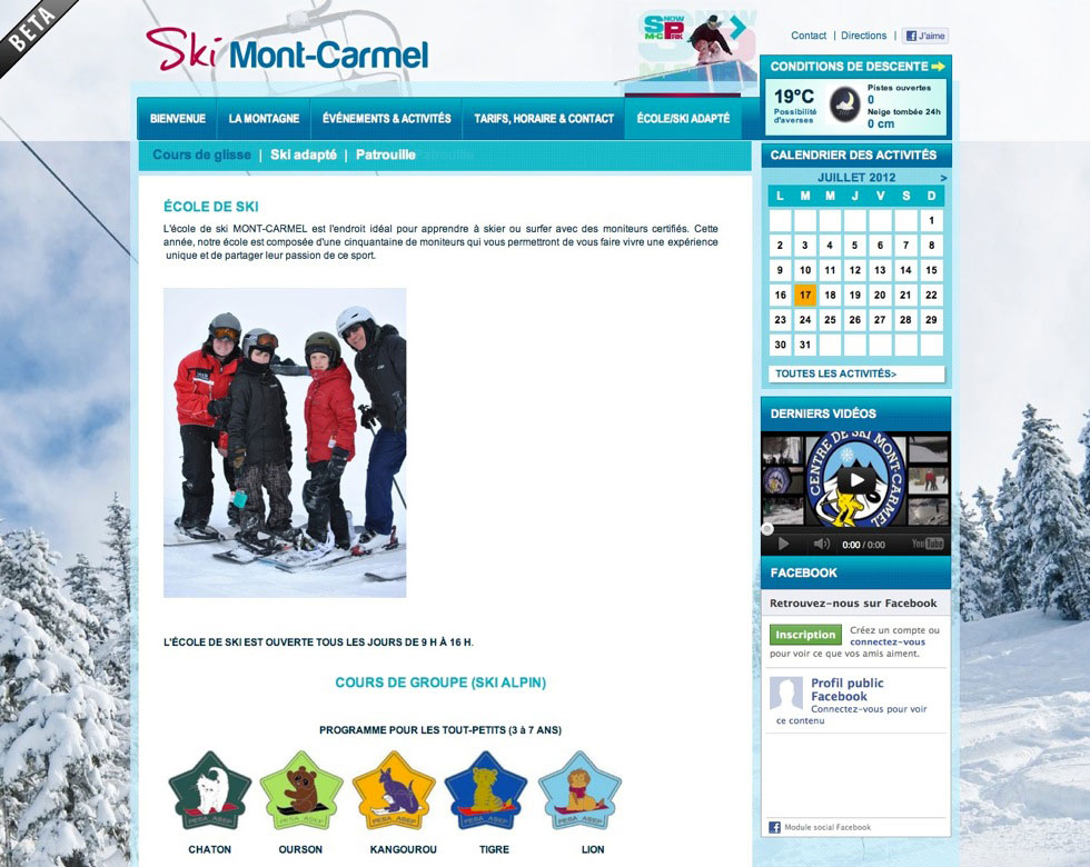 Le centre de ski Mont Carmel avait décidé de mettre les obuchées doubles pour améliorer son image web, calendrier automatique, météo automatique, gestionnaire d'événement, de videos, page de réseaux sociaux, ... Le site a fermé ses portes en début 2012 pour différentes raisons.