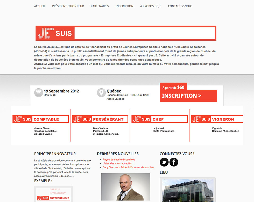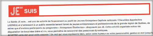 La Soirée JE suis… est une de activité de financement au profit de Jeunes Entreprises Capitale nationale / Chaudière-Appalaches (JECNCA) et s’adressant à un public essentiellement formé de jeunes entrepreneurs et professionnels de la grande région de Québec. Cette activité organisée autour de dégustation de bouchées bière et vin.